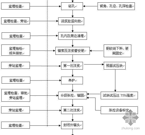 规范严格的锚杆锚索施工程序图,我司承接每一项锚杆锚索工程都严格按公司施工程序执行,以确保工程质量,我司的锚杆锚索施式队有30余人,所有员工上岗前都经过严格的培训。
